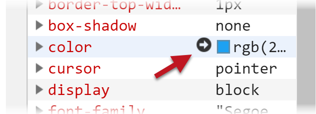 This is where we want to start. Look for the word "color" in the list of computed properties (they are listed alphabetically). You can also filter to all color style definitions by entering "color" in the Filter box at the top. The word "color" will be followed by a small box that shows the element's text color. Hovering over this box with a mouse causes a small arrow to appear.