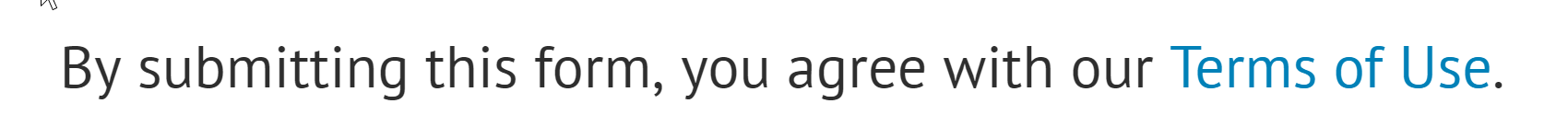 A form ends with a line of text that reads: "By submitting this form, you agree to our Terms of Use." The dark gray (#2E2E2E) body text has 13.6:1 contrast on a white background. The blue (#0079AD) "Terms of Use" link has 4.8:1 contrast, so text meets the contrast requirements.