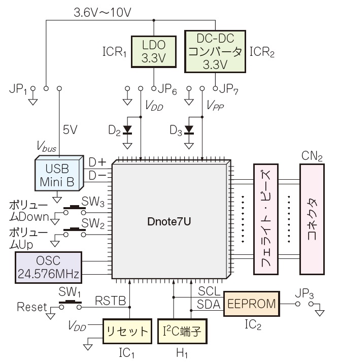 内蔵オーディオDSPの機能を変更するためのI2C端子があります.Dnote7UとEEPROMの両方のレジスタ設定データは,付属のソフトウェアを使って書き込むことができます.