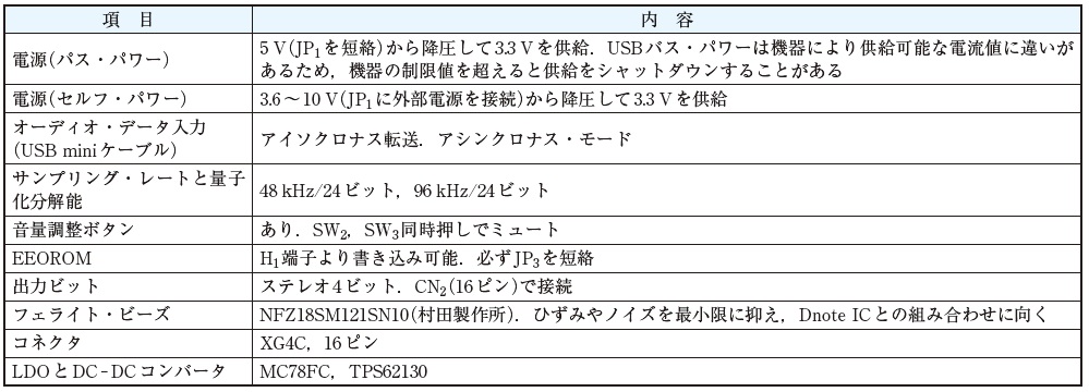 基板サイズは6×6cmでUSBやスピーカへの接続用コネクタが付属しています.電源はUSBのバス・パワーとセルフ・パワー(3.6~10VをUSBとは別に供給)を選択可能です.バス・パワーは機器によって電流供給能力が異なり,バス・パワーでは最大出力が出せない場合があります.