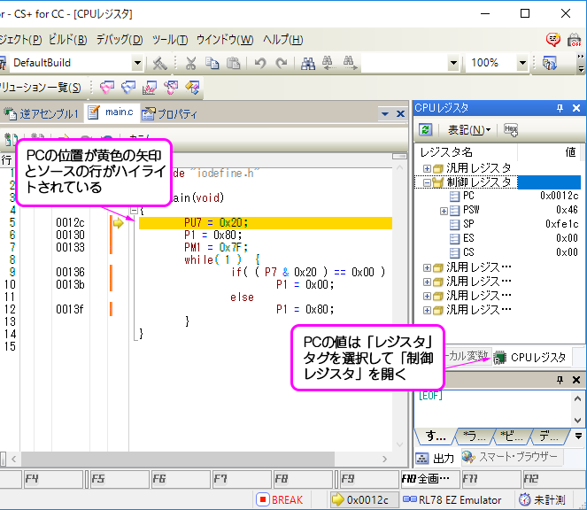 さて,デバッグしなければならなくなったときのためにEZエミュレータの操作を覚えておくのも良いですね.まずプログラムを最初からもう一度ゆっくり動かしてみましょう.