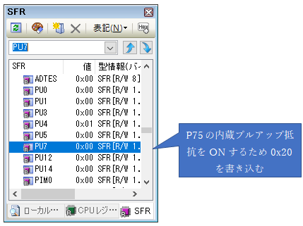 次にSW1の値を確認します.P75なのでP7の値に注目しながら,SW1を押しながら「最新の情報に更新」,離して「最新の情報に更新」して変化するかを確認します.