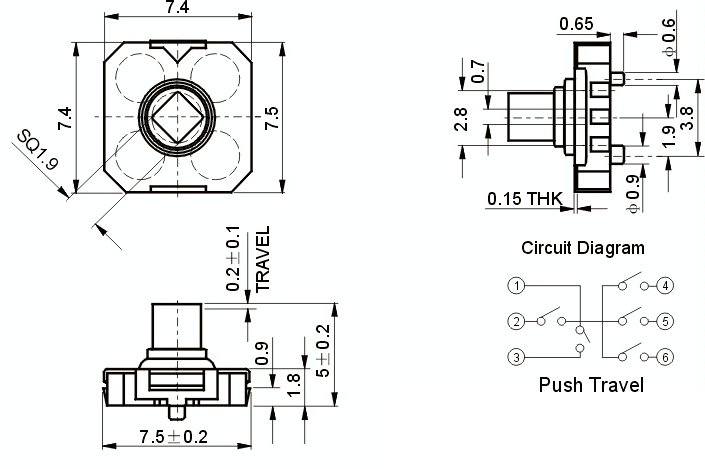5方向スイッチ、表面実装仕様、上、下、左、右、押下の5方向スイッチ、外形寸法:7.5x7.5mm、表記価格:1