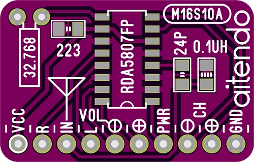 RDA5807FPを搭載したFMラジオモジュール、表面実装部品はすべて実装済み、標準付属品の32.768KHzクリスタルのみをはんだ付けすればすぐに使用可能です。マイコンは不要です。RDS/RBDS、受信周波数範囲:50〜115MHz、電圧制御発振器(VCO)内蔵、 ループフィルタ内蔵、自動選局機能、自動利得制御(AGC)機能、アダプティブノイズキャンセリング機能、動作電圧範囲:2.7〜3.3V、接続インターフェース:2.54mmピッチSIP-10、スルーホール、基板寸法:26.7x17mm、回路図、表記価格:1