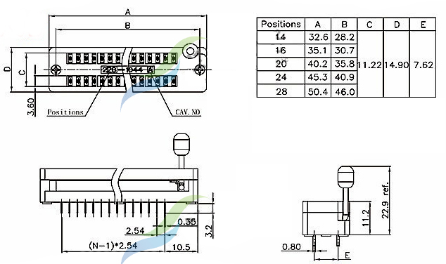 狭体ゼロプレッシャーICソケット、14P、ボディ幅:14.9mm、リード:角ピン、0.8x0.35mm、2.54mmピッチ2列、列幅:300MIL、お一人様5点限り、表記価格:1パック=2個入り