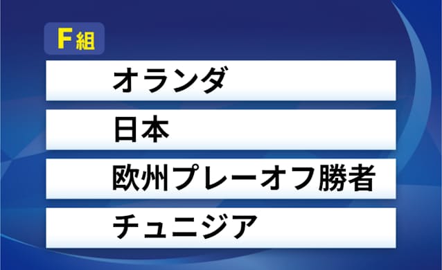 国際サッカー連盟(FIFA)ランキングで日本は18位、オランダは7位、チュニジアは40位。来年3月に行われる欧州POでウクライナ、スウェーデン、ポーランド、アルバニアで争う枠の勝者が、日本と同じF組に入る。1次リーグの開催地は、米ダラス、ヒューストン、カンザスシティー、メキシコのモンテレイのいずれかで、キックオフ時間も含めて6日(日本時間7日未明)に発表される。