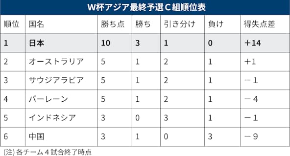 9月の中国戦(7-0)とバーレーン戦(5-0)を含め、4試合を戦って3勝1分け、勝ち点を10とした日本は2位以下を大きく引き離し、首位を守っている。