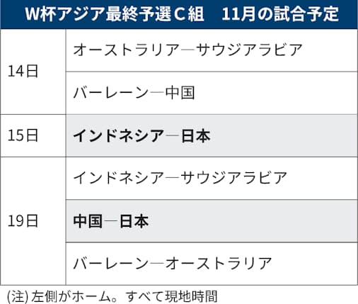 11月の2試合(15日インドネシア戦、19日中国戦)はいずれもアウェーとなる。本来なら14日に開催するはずだったインドネシア戦は、相手協会との合意で1日延ばして15日開催となった。
