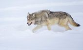 A majestic Arctic wolf strides through a snowy woodland. Its thick, white fur contrasts beautifully with the muted browns and grays of the winter landscape. The wolf's gaze is direct and intense, its golden eyes piercing the viewer. Snowflakes gently fall, adding to the serene, yet wild, atmosphere. The image evokes a sense of both power and tranquility.
