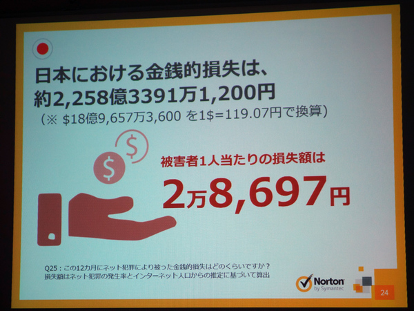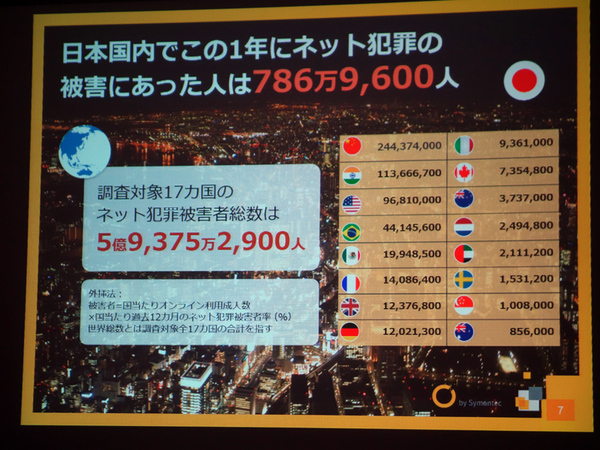 今回ノートンは、17カ国で合計1万7125人に対してオンラインで調査をおこなった。調査対象17カ国におけるネット犯罪の被害総額は約1500億米ドルで、日本における金銭的損失は約2258億円、被害者1人あたりの損失額は2万8697円だった。日本のネット犯罪の被害者数は786万9600人で、調査対象国では最も低いが、金額別では11位にランクインしており、1人あたりの被害金額が大きいことがわかったという。