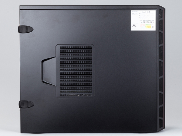 FRGAB450F/WS5/NTKのサイズは、およそ幅200×奥行485×高さ423mm。サイズ的にはスタンダードなミドルタワーケースで、デザイン的にもザ・ゲーミングマシンのようにド派手ではなく、比較的シンプル。前面に赤いラインが入っており、控えめだがゲーミングマシンとしてのアクセントがあるのも好印象だ。