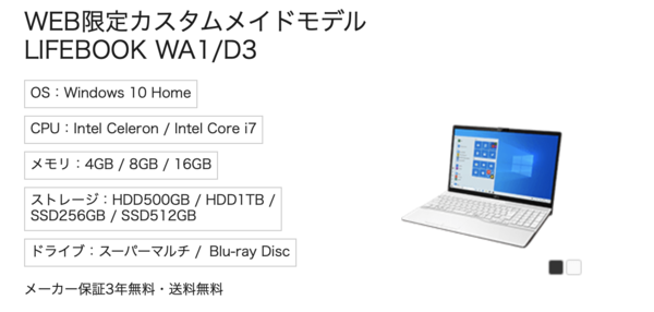 キャンペーン対象製品のひとつは、15.6型ノートPC「LIFEBOOK WA1/D3」で、主な構成例は以下の通り。