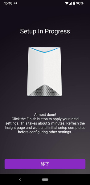続いて、画面下の「デバイスの表示」をタップするとデバイス画面が開き、さらに設定が必要であることが表示される。これをタップするとOrbi Proの動作モード(デバイスモード)の選択画面になるので、「ルーター」を選択して「次へ」をタップする。