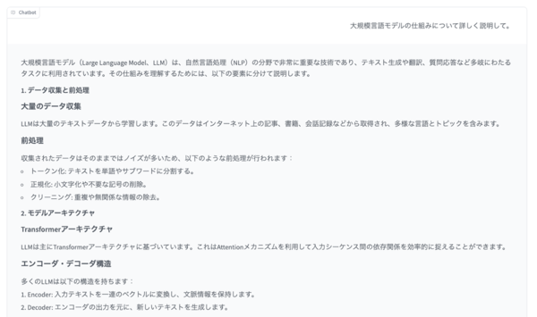 生成された回答の例。読みやすく構造化されており、日本語能力もかなり高いと思われる。生成スピードもかなり速い。