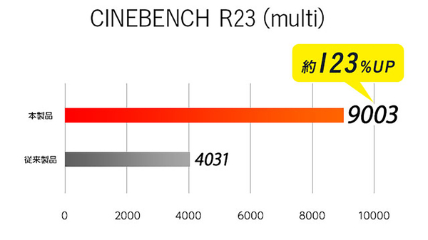 CPU性能を計測できるベンチマークソフト「CINEBENCH R23」を使って、インテルN100搭載のmouse B4-I1U01PG-B(メモリー容量16GB)と、Celeron N4120搭載の従来製品(メモリー容量8GB)の性能を比較