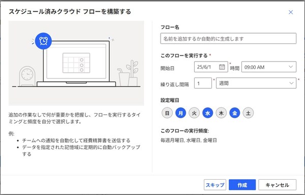 下段の「このフローの実行頻度」に設定内容が反映されます。たとえば上図の場合は「2025年6月1日の午前9時から、毎週月曜日、水曜日、金曜日にフローを自動実行する」という設定です。