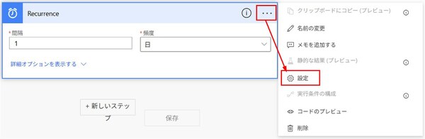 「トリガーの条件」は、「繰り返し(Recurrence)」トリガーの右上にある「…」をクリックし、メニューから「設定」を選べば設定できます。