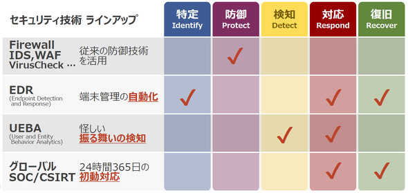 この防止策では、「複雑怪奇」と加納氏も表現するほどの、NTTデータ社内ネットワークのセグメント分けの見直しや、UEBA(User and Entity Behavior Analytics)導入による疑わしい動きの検知も進めているが、中でも重視したのがレスポンスの部分だ。