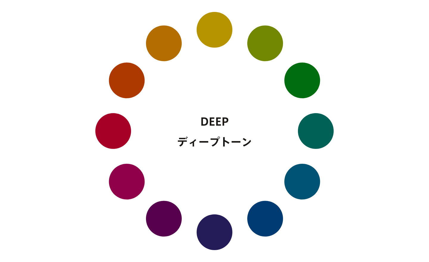 ビビッドに対して彩度と明度をやや落とした色相群です。少し黒が混ざることで、クラシックで上品な印象を与えます。色の鮮やかさや豊かさを残しながら、落ち着いた印象も与えることができるため、秋冬のファッションなどにもよく使われます。また、和を演出するための配色にもよく用いられます。