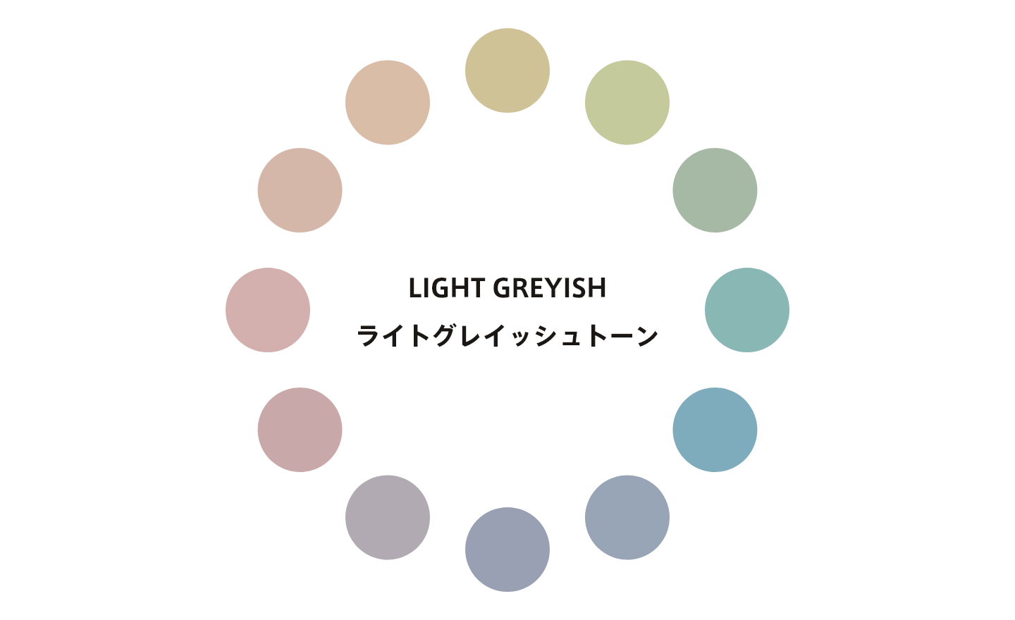 ペールトーンをやや濁らせたような色相群です。やはり背景や模様などに使われることが多いですが、彩度がおさえられているため、ペールトーンより大人っぽい印象になります。似たような彩度のトーンと組み合わせて上手に使うと、上品な雰囲気を作り出すことができます。
