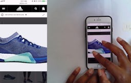 A user at Adidas zooms to inspect a shoe, and the resulting zoomed image is high-resolution, enabling her to successfully visually inspect the product.