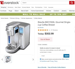 Telling users a product is out of stock and removing the “Add to Cart” button, as is the case here at Overstock, brings them to a complete halt and prevents the user from purchasing the item.