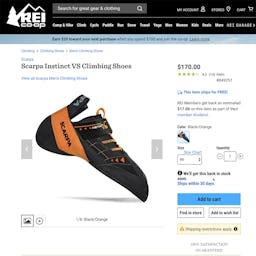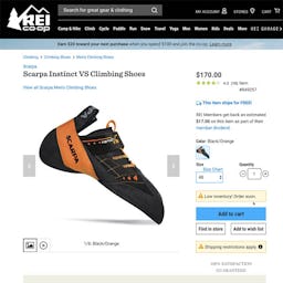 At REI, users are allowed to purchase shoes that are temporarily out of stock. By allowing users to purchase the shoes in this temporarily out of stock size, REI makes it much less likely that users will leave the site to seek the shoes elsewhere, which our Product Page testing shows 30% of users are likely to do. Note the message, “Ships within 30 days,” alerting users to the longer delivery time for this item.