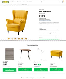 IKEA, like 28% of benchmarked sites, fails to provide a cross-sell section for alternative products. Users who may like the style of this chair, but perhaps feel it’s not quite the right fit, must continue their product search using category navigation or search, or choose to abandon the site altogether. Note that the “You might also like” section contains only supplementary products (discussed as the 7th implementation below).