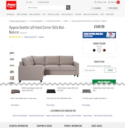 Argos doesn’t provide a cross-sell section for supplementary products, missing an opportunity to entice users viewing a sofa with sofa covers, rugs, lamps, etc. Note that the cross-sell section at the bottom of the page contains only alternative products (discussed in implementation 6 above).