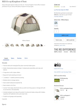 REI offers “Related items” (i.e., supplementary products) in a sidebar. Here, users looking at a tent see a garage and a footprint for the specific tent they’re viewing, which are reasonable items to offer and will likely encourage some users who decide to purchase the tent to add one of the supplementary products as well.