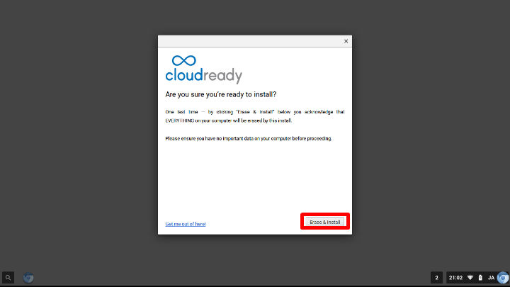 ハードドライブ内は全部消去されますよという注意文が表示されますが、いまのThinkPad X240には Ubuntu14.04 なので気にせず「Erase Hard Drive & install CloudReady」ボタンをクリックします。OSがWindowsやMacOSの場合は、リカバリメディアを作成しておくことをお勧めします。