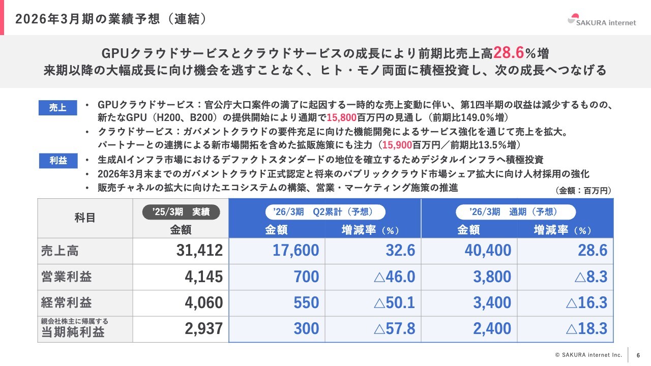 今期は「さくらのレンタルサーバ」「さくらのクラウド」、GPUクラウドサービスに至るまで、すべてにおいて大幅な投資と採用を実施する計画です。したがって、今期については一定の利益水準となる計画です。