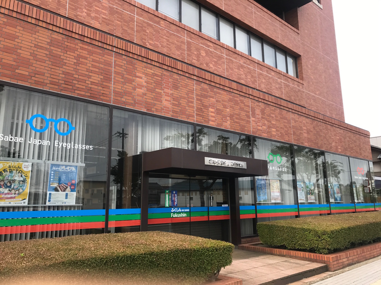 福井信用金庫(ふくしん)の壁に、めがねのまちさばえ&めがねマーク
