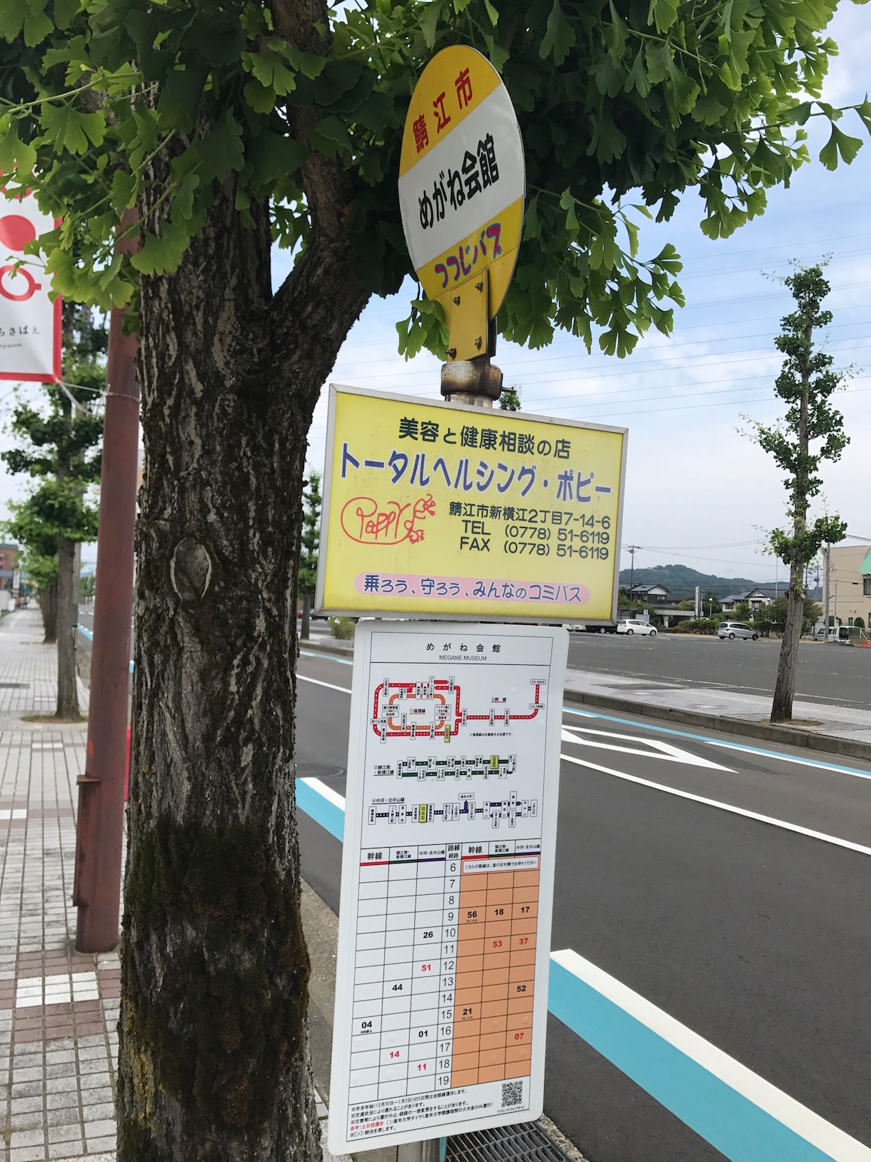 「めがね会館」というつつじバスのバス停。サンドーム福井へ行く便、もう少しあってもいい?