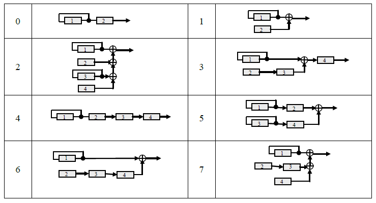 4つの発振器(オペレータ)のつながりを選ぶ、アルゴリズム。第一オペレータを鳴らすアルゴリズム1を選択(ALG:1)
