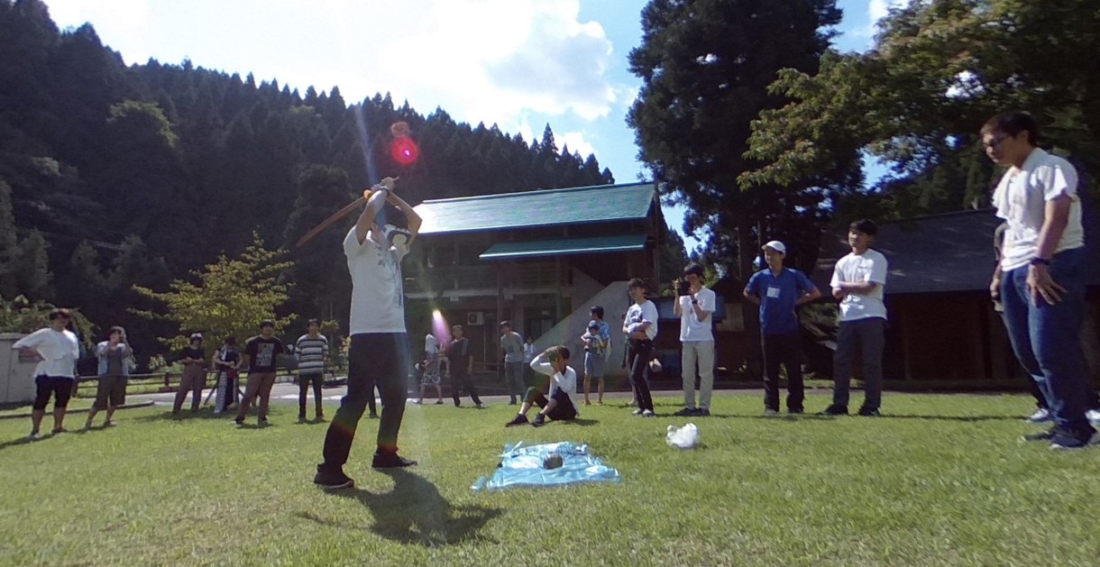 目隠しの替わりに、スマホVR。下を向いて5回回って、さぁスイカは割れるか!?