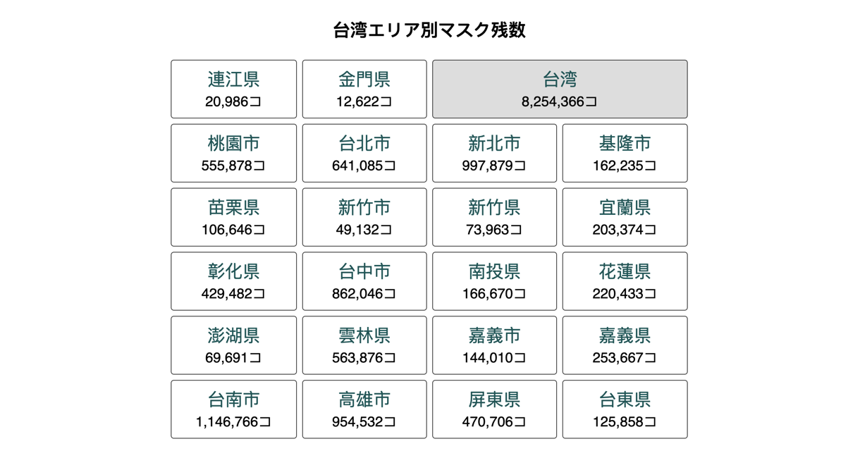 「台湾エリア別マスク残数」
