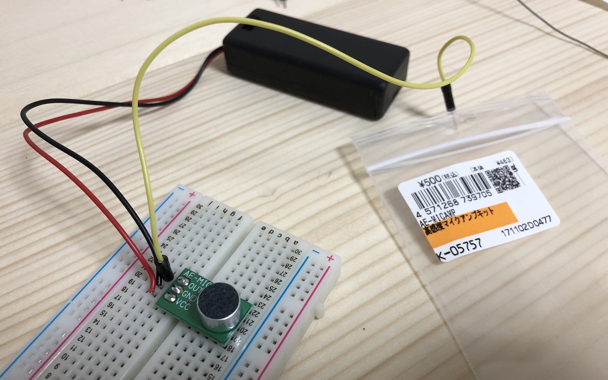 秋月電子の高感度マイクアンプキットは3ピン接続だけでお手軽ですが、電源のノイズを大きく拾ってしまうので、波形のきれいな単3電池を使うなど、一工夫いります。