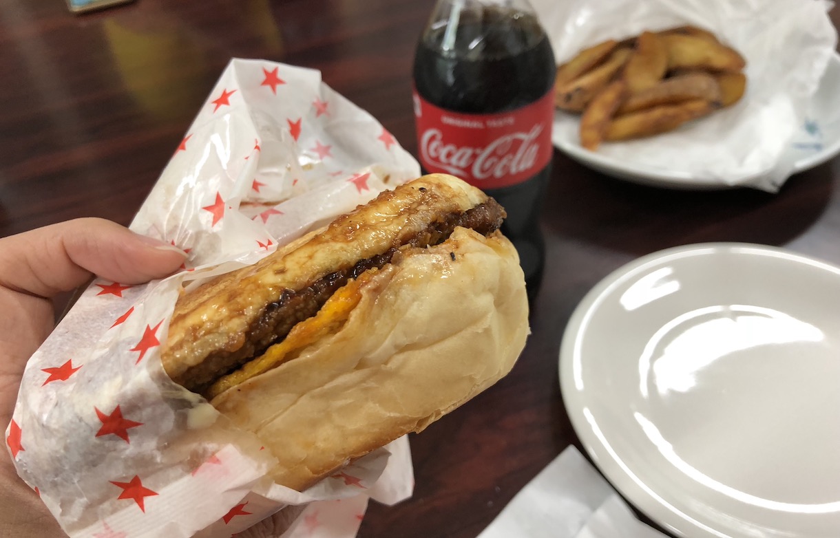 お昼はナンバーワンに輝いたという、佐世保高専すぐそばの「佐世保バーガー」大きい!