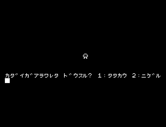 100 CLS 110 LC16,10:?CHR$(237) 120 LC0,14:INPUT"カダイガアラワレタ ドウスル? 1:タタカウ 2:ニゲル",N 130 IF N=1 GOTO 200 140 IF N=2 ?"ク、ニゲラレナイ":GOTO 100 150 GOTO 100 200 CLS 210 LC16,10:?"." 220 LC0,14:?"カダイヲ ヤッツケタ!"