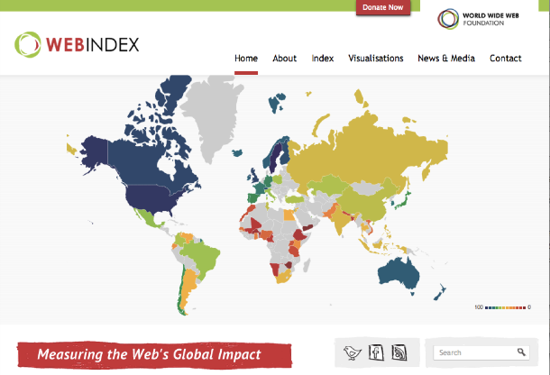 World Wide Web財団によって設計、制作されたWeb Indexは、Webの成長、有用性、および人々と国家への影響の世界初の多次元な指標です。これは、61の先進国ならびに発展途上国を対象として、Webの政治的、経済的、および社会的影響を評価する指標を取り入れ、同時にインターネット接続性とインフラの指標も取り入れています。これは、Web Indexの初版であり、毎年発行されます。最終的には、経時的な傾向の比較、および他国を通じたパフォーマンスの比較を可能にし、人類のとってのWebの価値に対する認識を継続的に向上させるでしょう。