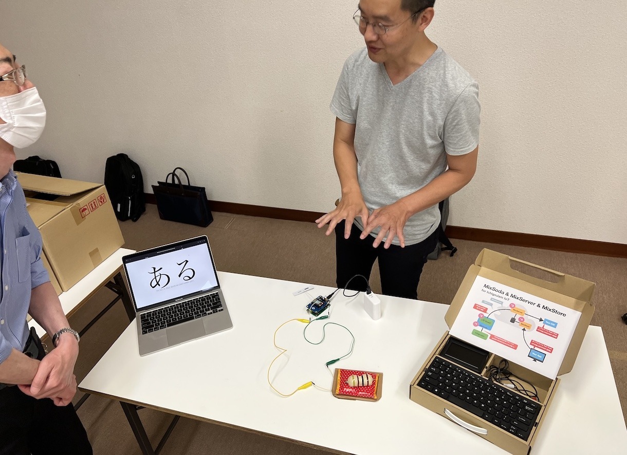 ナチュラルスタイル松田さん、新開発のIchigoJam用IoT、MixSodaの展示!座布団の上のタカラモノ、抵抗型はんだごて台があるかないかをリアルタイムに遠隔検出!