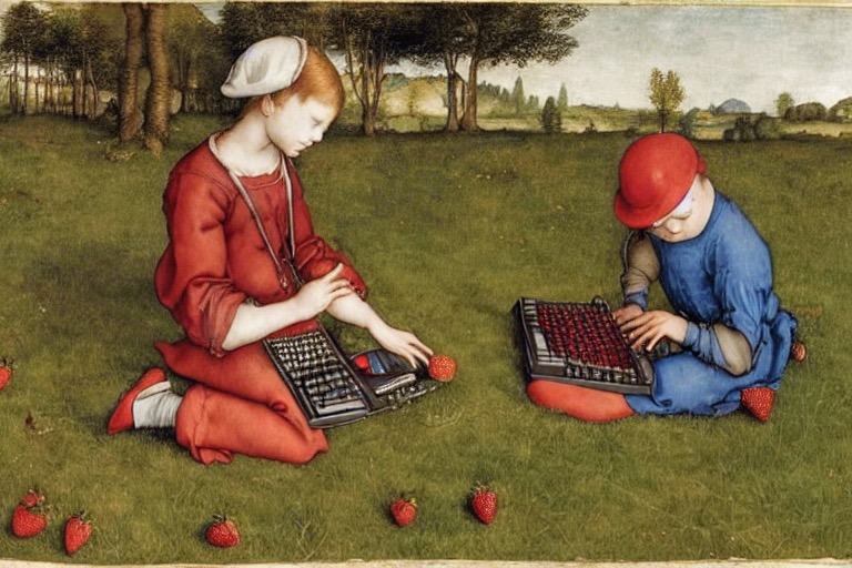 イチゴ帽子をかぶる少年と少女が原っぱでプログラミングする様子