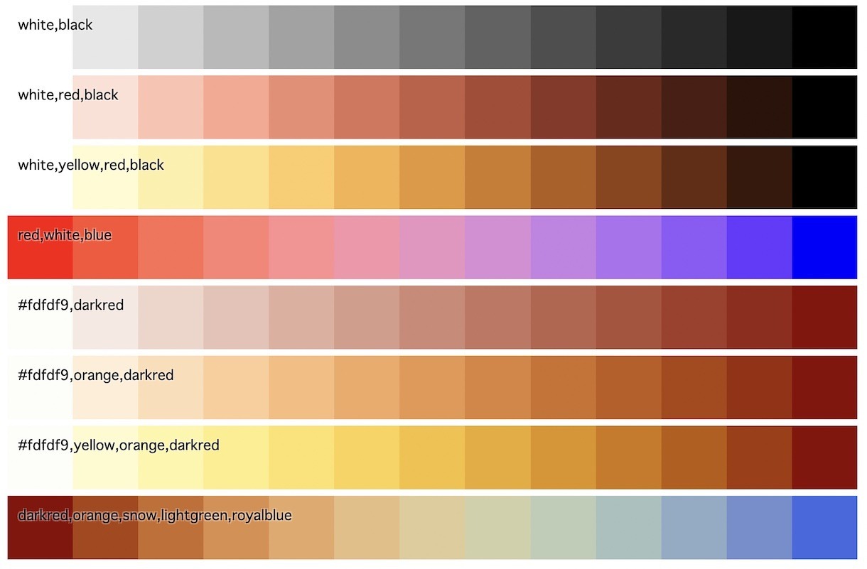 const cs = chroma.scale(["red", "white"]).mode("rgb").out("hex");