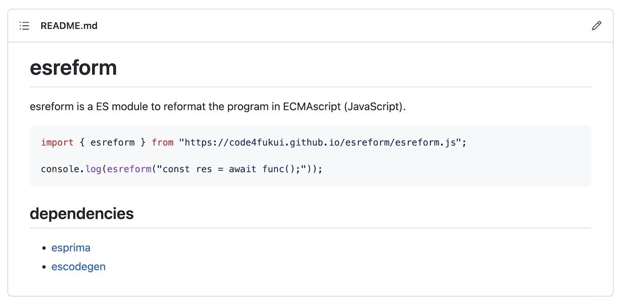 いろいろと組み込めるように単独リポジトリ化。トップレベルawaitに未対応だったので仮対応。プログラムはたった9行。(esreform.js)