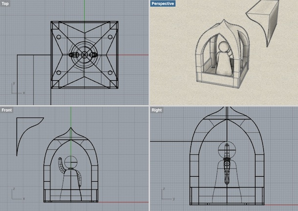 モデリングツールでデータ化します。曲線を立体化して4方向にコピーして切り取る。箱をつくって、ついでに中の人も一緒につくっちゃえると便利ということで組み合わせました。