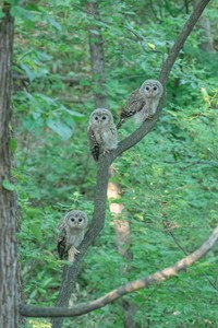 夕方になると夜行性のため動きが活発で、餌を取る練習などして兄弟で遊んでいるようでした。段々奥の方に進んでいき、急に枝に乗っているのが見えて、フクロウが逃げないように回り込み、枝に三羽いるのを見つけて興奮してシャッターを沢山切っていました。
