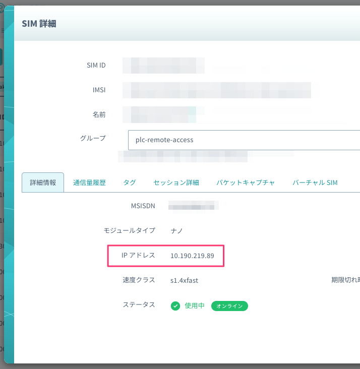 [詳細情報] タブにある「 IP アドレス」の値を控えておきましょう。これが LTE ルーターの SIM に割り当てられる IP アドレスで、このあとの手順で KV STUDIO の接続先として指定します。